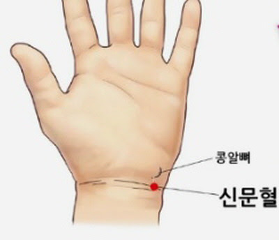 새끼손가락과 연결된 손목 주름 주힁문에서 인대를 찾을 수 있고 인대에서 엄지손가락 안쪽으로 살짝 가면 쏙 들어가는 곳에 위치한다